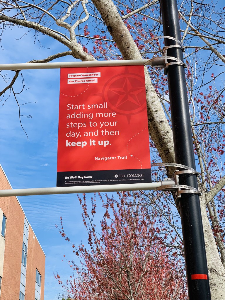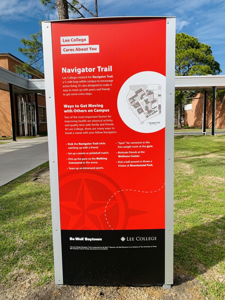Lee College has implemented the Navigator Trail to boost on-campus exercise for faculty, staff and students. They requested assistance on building motivation, wayfinding signs from Be Well™ Baytown and the UT Center for Health Communication.
